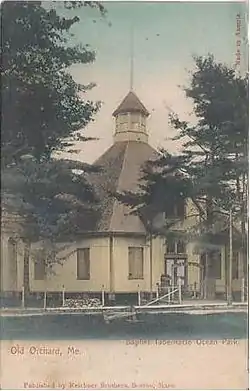 The idea of an oceanfront camp meeting community arose at a meeting of Free Will Baptists in Weirs Beach, New Hampshire in 1880. Land was acquired in northern Saco (which Old Orchard Beach was then still part of), and summer cottages were soon built. This building was constructed in 1881 by James Bickford to a design by Dow & Wheeler, inspired in part by the popularization of octagon houses by Orson Squire Fowler in the 1840s and 1850s.[2] The Temple continues to be a central focus of the summer community in Ocean Park.