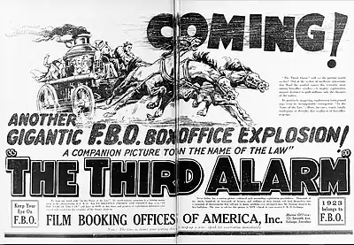 The Third Alarm is a 1922 American silent melodrama directed by Emory Johnson. FBO released the film in January 1923. The film's "All-Star" cast included Ralph Lewis, Johnnie Walker, and Johnson's wife, Ella Hall. Emilie Johnson, Johnson's mother, wrote both the story and screenplay. The Third Alarm was the second picture in Johnson's eight-picture contract with FBO.[1]