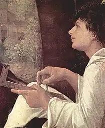 The Three Philosophers was finished around 1509, and the current name of the work derives from a writing of Marcantonio Michiel, (1484–1552) who saw it just some years after in a Venetian villa.[4] The three figures portrayed are allegorical: an old bearded man, possibly a Greek philosopher; a Persian or Arab philosopher; and a sitting young man, enclosed within a natural landscape.[5] In the background is a village with some mountains, the latter marked by a blue area whose meaning is unknown. The young man is observing a cave on the left of the scene, and apparently measuring it with some instruments. Since the end of the 19th century scholars and critics rejected on various grounds the earlier view that it is a representation of the three Magi gathered before Jesus' grotto.[6][7][8]