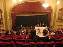 The auditorium has a parterre-level orchestra and a single balcony, with a small stage behind the proscenium arch.[24][25] The auditorium has a seating capacity of 1,495.[26] Every effort was taken to ensure that no seats had obstructed views,[25][27] which led to the Town Hall's long-standing mantra "Not a bad seat in the house".[3] The balcony is cantilevered from the structural framework, which obviated the need for columns that blocked audience views.[21] The balcony has a loge, or theatrical box.[18][25] The front of the balcony contains a wrought-iron balustrade. The auditorium retains most of its original wicker seat designs, except for the loge, where modern theatrical seats have been installed.[28] The original seats were capable of unusually high levels of acoustic absorption; they were replaced in the 1980s by seats with similar acoustic qualities.[29] The writer Harold C. Schonberg wrote that only the seating on the balcony had good acoustics, as the balcony's presence muffled the sounds at orchestra level.[30]