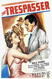 The Trespasser is a 1947 American action film directed by George Blair, written by Dorrell McGowan, Stuart E. McGowan and Jerome Gruskin, and starring Dale Evans, Warren Douglas, Janet Martin, Douglas Fowley, Adele Mara and Gregory Gaye. It was released on July 3, 1947, by Republic Pictures.[1][2][3]