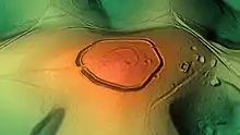 The summit on which both the causewayed enclosure and the hillfort stand is St Roche's Hill, an outcrop of the Upper Chalk that lies at the western end of a ridge. The hill is four miles north of Chichester, near to Goodwood Racecourse.[17] It rises above the neighbouring hills and so is clearly visible from all sides.[18][17] There is an Ordnance Survey (OS) trig point at the top of the hill, which has an elevation of 206 m (676 ft);[19][20] an earlier trigonometrical station, placed on the hill in 1791, was probably at the same location.[20] The causewayed enclosure consists of at least four circular or partly circular ditches. The exact nature of these earthworks is now hard to determine because the hillfort partly overlies the earlier ditches.[18] The innermost ditch, which encloses an area of 0.95 ha (2.3 acres), has an internal bank, and may have been the first of the Neolithic ditches to be dug. Concentric with this is a second ditch that lies a short distance outside the innermost ditch; this second ditch was thought by E. Cecil Curwen (who excavated the site in 1928 and 1930) to spiral out so that the circuit extended more than a full circle around the centre of the enclosure. Curwen named the outermost part of this earthwork the "spiral ditch", at the point on the west where it paralleled the second ditch, but later surveys make the relationships of the ditches less certain, and it is now thought that the appearance of these ditches may be the result of multiple enclosure ditches dug over a long period. A further, outer, ditch was thought by Curwen to only appear from under the Iron Age earthworks at the north of the site, but it has since been suggested that cropmarks visible to the west represent part of this ditch. There may also be further early earthworks that have been completely overlain by the hillfort.[21] The causewayed enclosure ditches were probably dug in the first half of the fourth millennium BC.[22] The site was one of the first to be confirmed as a causewayed enclosure by excavation; the other four known by 1930 were Whitehawk Camp, Knap Hill, Windmill Hill and Abingdon.[23]