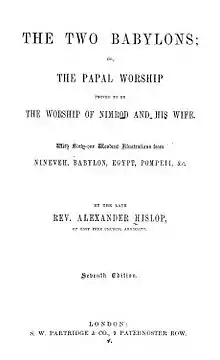 - Hislop, Alexander (1903). The two Babylons, or, The papal worship proved to be the worship of Nimrod and his wife : with sixty-one woodcut illustrations from Nineveh, Babylon, Egypt, Pompeii, &c. London: S.W. Partridge.