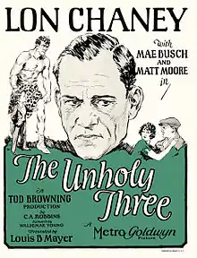 The Unholy Three is a 1925 American silent crime melodrama film involving a trio of circus conmen, directed by Tod Browning and starring Lon Chaney. The supporting cast features Mae Busch, Matt Moore, Victor McLaglen, and Harry Earles. The Unholy Three marks the establishment of the notable artistic alliance between director Browning and actor Chaney that would deliver eight films to M-G-M studios during the late silent film era.[2][3][4]
