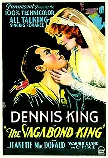 The Vagabond King is a 1930 American Pre-Code musical operetta film photographed entirely in two-color Technicolor. The plot of the film was based on the 1925 operetta of the same name, which was based on the 1901 play If I Were King by Justin Huntly McCarthy. The play told the story of the real-life renegade French poet named François Villon. The music of the film was based on a 1925 operetta, also based on the play If I Were King by McCarthy. The operetta is also titled The Vagabond King with music by Rudolph Friml and lyrics by Brian Hooker and W.H. Post. The film was nominated for an Academy Award for Best Art Direction.[2]