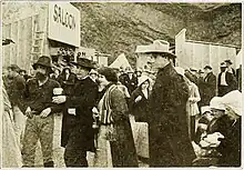 Siegmund Lubin reportedly spent over $25,000—a monstrous sum in 1914 for a single action sequence—to purchase two old coal-fired locomotives, the needed freight and passenger cars, and to stage the spectacle.[8] Despite the expense, Lubin justified it as an investment, for the studio later used the same wreck footage in at least four other productions.[8][lower-alpha 4] Fielding deployed 30 cameramen with 12 different cameras to film the collision, minimizing the chances of losing optimal footage of the one-take event due to either malfunctioning equipment or other factors.[8] No one was aboard the trains except two "experienced railroad engineers" hired by the director, who instructed them to jump off their respective trains "a minute before the impact". Following the crash, Fielding also filmed needed passenger-rescue scenes around the smoking wreckage.[12]