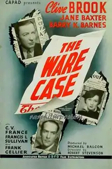 The Ware Case is a 1938 British drama film directed by Robert Stevenson and starring Clive Brook, Jane Baxter and Barry K. Barnes.[1] It is an adaptation of the play The Ware Case (1915) by George Pleydell Bancroft,[2] which had previously been made into two silent films, in 1917 and 1928.[3] It had been a celebrated stage vehicle for Sir Gerald Du Maurier.[4] The film was made at Ealing Studios with stately home exteriors shot in the grounds of Pinewood.[4] Oscar Friedrich Werndorff worked as set designer.[5]