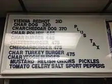 The establishment is known for its char-grilled food, especially its hot dogs and hamburgers (commonly called char-dogs and char-burgers).[5] A Wiener Circle char dog with "the works" is a grilled Vienna Beef hot dog on a warm poppy seed bun, topped with mustard, onions, relish, dill pickle spears, tomato slices, sport peppers and a dash of celery salt.
