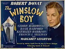 The Winslow Boy is a 1948 British drama film adaptation of Terence Rattigan's 1946 play The Winslow Boy.[3] It was made by De Grunwald Productions and distributed by the British Lion Film Corporation. It was directed by Anthony Asquith and produced by Anatole de Grunwald with Teddy Baird as associate producer. The adapted screenplay was written by de Grunwald and Rattigan based on Rattigan's play. The music score was by William Alwyn and the cinematography by Freddie Young.[4]