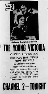 The Young Victoria is an Australian television film of 1963 which aired on ABC on 27 March 1963. Based on the play Victoria Regina, it is a 60-minute drama about the courtship and marriage of Queen Victoria to Prince Albert. It stars Lola Brooks as Victoria and Ric Hutton as Albert.[4][5][6]