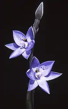 Thelymitra simulata, commonly called the collared sun orchid,[2] is a species of orchid that is endemic to south-eastern Australia. It has a single fleshy, channelled leaf and up to six blue flowers with small darker spots. It grows in higher altitudes places part and the flowers have a purple lobe with a yellow tip on top of the anther.