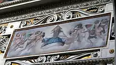 The vault is divided into trapezoidal panels which are separated by delicate white and gold stucco bands of vases and candelabra. Pairs of dainty stucco angels are resting on the edges of the lunettes in the corners. The trapezoidal panels are filled with paintings of the Four Evangelists with their traditional symbols and angels. In the central medallion an Angel with a laurel wreath appears. Saint Matthew and Saint Mark are accompanied by the four Doctors of the Church: Pope Gregory the Great and St. Ambrose with the former, St. Augustine and St. Jerome with the latter. According to the modern critics significant parts of the painted decoration were executed by Mazzoni while others are contributions of his workshop. The differentiation was made more difficult by a repainting of the frescoes in the 18th century (especially the figure of St. John the Evangelist, the corresponding lunette and St Luke).