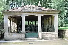 In October 1920, there was a decision to request a license to explore a second spring (in Prado), due to growth in visitors: by December a project was presented to the council.[1] This project did not proceed well because the site selected for the emergency release was not adequate, resulting in the waters escaping through clay and iron-rich layers resulting in the liberation of gases and loss of water.[1] Therefore, worked continued into 1921, and resulting water directed to the pavilion by a stoneware pipeline of stoneware installed in a separate gallery prepared for technical visits.[1]