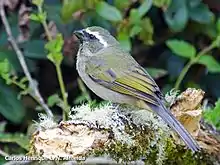 The thick-billed saltator (Saltator maxillosus) is a species of saltator in the family Thraupidae. It is found in highland Atlantic Forest in southeastern Brazil, far northeastern Argentina (only Misiones Province), and perhaps far eastern Paraguay.[1] Unlike most other saltators, it is sexually dichromatic: Females resemble a green-winged saltator, but with a thicker bill, greener face and buff throat. The male thick-billed saltator is unique with its long white eyebrow, grey back, and black and orange beak (amount of orange varies).