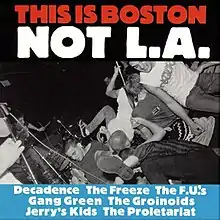 This Is Boston, Not L.A. is a hardcore punk compilation released in 1982. It is considered the definitive album from the Boston hardcore scene, as several of its most prominent bands appear on the record, namely, Jerry's Kids, the Proletariat, the Groinoids, the F.U.'s, Gang Green, Decadence, and the Freeze.[1] For them, with the exception of the latter, This Is Boston, Not L.A. was also their debut release. Al Barile's band, SSD, were asked to contribute, but they refused to participate.[2]