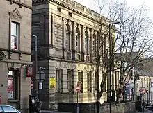 This is a listed building in Mawdsley Street, Bolton, Greater Manchester. It was designed by Sorby in 1866, possibly in collaboration with Reeves, who was surveyor of county courts at that time. The exterior is of rusticated ashlar, and it has a slate roof. There are two storeys. The frontage has entrances below, with "paired panelled and studded doors", and a row of ten round-headed and balustraded windows above. "All openings have initials VR, superimposed on foliate key-stones". There are Corinthian capitals, and a "Modillion eaves cornice". The back of the building is of brick, with windows for the court room.[51]