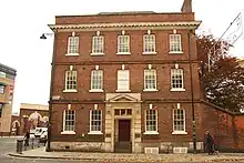This is a grade II* listed building,[87] and the subject of a conversion by Sorby.[32] It was originally a house designed by Nicholas Hawksmoor for Mr Eastland Hawksmore in the Beast Market, Gainsborough, Lincolnshire, in 1759. In 1871, Sorby converted it into a county court and offices, with the court entrances facing Beaumont Street. Hawksmoor's design had originally been "a large square brick building [in 18th-century style], with square windows and doors, and gauged brick strings and arches". Sorby made major changes to the structure.[88][89] The Building News described the new works:[90]