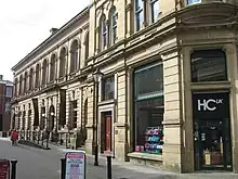 This is a grade II listed building,[92] designed by Sorby,[32][93] who was invited to a celebratory supper at the Royal Hotel, Barnsley, after the opening.[94] The courthouse originally fronted both Regent Street (no.22), and Eastgate, Barnsley, South Yorkshire, and was a new build at the behest of the Lords Commissioners of the Treasury, under whose auspices Sorby was architect. It was opened for court business on 1 December 1871. It was originally budgeted at £4,000 (equivalent to £396,235 in 2021),[20] but ultimately cost £7,000 (equivalent to £693,412 in 2021) for the build, or more than £10,000 (equivalent to £990,588 in 2021) including land and other expenses.[27][95] The Midland Railway Company had taken Barnsley's existing 1861 county court building by Charles Reeves as its station, for waiting rooms and a post office,[96] and paid some of the cost of Sorby's new court house on a nearby site, "two hundred yards higher up Regent Street". An article by Sorby, published in the Building News, describes it thus:[20]