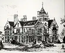 "Whitehill" is built of "plum coloured Luton grey bricks with ashlar dressings", and has a "two-gabled front", "various other gables", and "much cornicing". It has several bay windows, and a "recessed porch above which [the] wall is carried up to form a parapet at eaves level". When listed in 1975, it still had its mullioned windows.[86] It originally had a Broseley tiled roof with "ridges and knobs applied". Pine, pitch pine and oak were used for the internal joinery, the pine being "bright yellow" and "slightly stained and varnished". The main windows had "Venetian blinds in ornamental cases". The house had seven bedrooms, plus nurseries, dressing rooms, attics, cellars, kitchen and pantry, besides a knife room. The main floor included a dining room, drawing room, library, and "Mr Brown's room".[1]