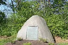 The University of Rochester and the Rochester community honored Swinburne with a memorial, Swinburne Rock, placed "beside the Genesee" near the University's Interfaith Chapel. The memorial, proposed in 1927 and dedicated in 1933, is a 26 ton glacial boulder holding a bronze plaque with verses from The Genesee sculpted by Alphonse A. Kolb.[6][10][11] According to local legend Swinburne's ashes were interred under the rock, but when it was moved in 1968 no remains were found.[12] News reports, however, indicate that the poet's ashes were scattered on the Genesee River in July, following his death.[13]