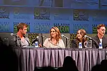 In May 2009, Chris Hemsworth was in negotiations to portray the title role after a back-and-forth process in which the 25-year-old actor was refused early on, then given a second chance to read for the part. Hemsworth's brother, Liam also auditioned for the role, but was passed on by Marvel Studios head Kevin Feige.[10] Kevin McKidd had also been considered for the role.[90] The next day, Marvel announced that Tom Hiddleston, who had worked with Branagh before and had initially been considered to portray the lead role, had been cast as Loki.[18] In June 2009, Feige confirmed that both Hemsworth and Hiddleston had signed on.[91] Feige mentioned that the film would take place on both modern day Earth and Asgard but Thor's human host, Dr. Donald Blake, would not be included.[91] In July 2009, Marvel announced that Natalie Portman would portray Jane Foster.[14] Jaimie Alexander and Colm Feore were reported to have joined the cast in September, with Alexander portraying Sif and Feore's role unrevealed, though it was thought to be a villain.[40] In an interview with Swedish news site Ystads Allehanda, Stellan Skarsgård stated that he had joined the cast, though he did not specify his role.[21] By late October Anthony Hopkins had been cast as Odin in the film.[46] The following month, Marvel announced that they had cast the Warriors Three; Fandral was to be played by Stuart Townsend, Hogun was to be played by Tadanobu Asano and Volstagg was to be played by Ray Stevenson.[31] Idris Elba was announced to have joined the cast, portraying Heimdall.[33] Natalie Portman revealed that Kat Dennings would be involved in the project, portraying Darcy, a coworker of Portman's Jane Foster.[24][92]