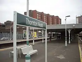 Thornton Heath is a railway station in the London Borough of Croydon in south London, 8 miles 64 chains (14.2 km) down the line from London Victoria.[2] It is on the Brighton Main Line between Norbury and Selhurst. The station is operated by Southern, who also provide all train services.The station is in Travelcard Zone 4.