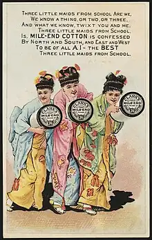In an 1885 interview with the New-York Daily Tribune, W. S. Gilbert said that the short stature of Leonora Braham, Jessie Bond and Sybil Grey "suggested the advisability of grouping them as three Japanese school-girls", the opera's "three little maids". He also recounted that a young Japanese lady, a tea server at the Japanese village, came to rehearsals to coach the three little maids in Japanese dance.[1] On 12 February 1885, one month before The Mikado opened, The Illustrated London News wrote about the opening of the Japanese village noting, among other things, that "the graceful, fantastic dancing featured ... three little maids!"[2]