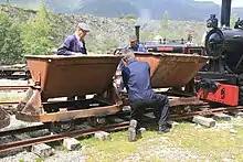 The steam locomotive 'Sir Tom' was built by W.G. Bagnall of Stafford in 1926 and named after Sir Tom Callender of British Insulated Callender's Cables (BICC). This 0-4-0 saddle tank narrow gauge locomotive worked at BICC in Kent until 1968. After being idle for thirty-three years, it arrived at Threlkeld in 2001, and since then has been overhauled. Sir Tom was rebuilt and is driven by Ian Hartland. The locomotive completed the first full season of work at Threlkeld Quarry and Mining Museum in 2010. Sir Tom is mainly used to haul passenger trains from the middle quarry into the inner quarry.[2]