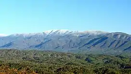 ![]() A snow-capped Thunderhead Mountain of the Great Smoky Mountains range rises above Cades Cove in Blount County, Tennessee | |
