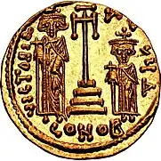 Tiberius was the youngest son of Constans II. His mother was Fausta, daughter of the Patrician Valentinus.[1] Although his eldest brother Constantine IV had been raised to the rank of co-emperor in 654,[2] in 659, shortly before his father's departure for Italy, Tiberius was also elevated by Constans to the rank of co-emperor, alongside his older brother Heraclius. The coronation ceremony took place between 27 April and 9 August. Given that most coronations took place in festive days, it's very likely that this one took place on Whitsunday (2 June).[3] In 663, Constans tried to have his sons join him in Sicily, but this provoked a popular uprising in Constantinople,[4] led by Theodore of Koloneia and Andrew,[5] and the brothers remained in the imperial capital.[4]
