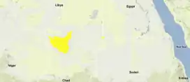The ecoregion covers 82,200 square kilometers (31,700 sq mi) in the volcanic Tibesti Mountains of Chad and Libya, and 1932-m peak of Jebel Uweinat on the border of Egypt, Libya, and Sudan. The climate is arid and subtropical, but can reach 0°C at the highest altitudes during the winter. Rainfall is irregular but more regular than the surrounding desert and many of the lower wadis are watered by rain which falls higher up.[2]