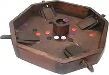 However, competition was quite fierce, and for several years starting in 1888 other game publishers came out with their own versions of the game using other names, including Spoof, Flipperty Flop, Jumpkins, Golfette, Maro, Flutter, and many others.[24] It became one of the most popular crazes during the 1890s, played by adults and children alike.[25]