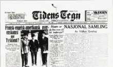 The newspaper achieved a bad reputation in the late 1920s and the 1930s. The paper published Vidkun Quisling's series of articles Russland og vi, and also early political documents from the Fascist party Nasjonal Samling. During the 1930s the number of subscribers decreased significantly, the newspaper had financial problems, and editor Rolf Thommessen was forced to resign.[6] The new editors did not want to continue the publication during the German occupation of Norway, and Tidens Tegn was discontinued in 1941.[7] One of the editors, Jonas Schanche Jonason, had to leave Norway for London during this period.[8] In 1945 a new newspaper with an old name, Verdens Gang, took over Tidens Tegn’s properties.[2]