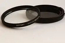 A Tiffen 52mm UV filter resting on a front end lens cap