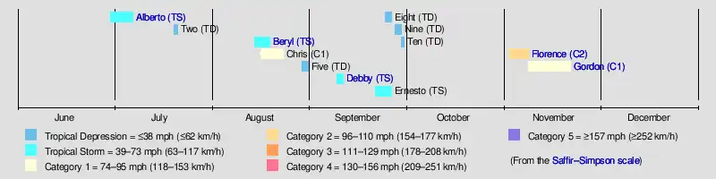 This season produced seven named storms; three attained hurricane status, though none became a major hurricane, a storm that ranks as a Category 3 or higher on the Saffir-Simpson Hurricane Scale.[1] Tropical Storm Alberto produced significant rainfall and flooding in the Southeastern United States, damaging or destroying over 18,000 homes, and inflicting $750 million (1994 USD) in damages.[2] In August, Tropical Storm Beryl produced heavy rainfall in areas of Florida, Georgia, South Carolina, and North Carolina, with moderate to heavy rainfall throughout several other states. Beryl caused numerous injuries, many of which occurred from a tornado associated with the tropical storm.[3] Tropical Storm Debby killed nine people throughout its path in September.[4] Hurricane Gordon in November caused damages from Costa Rica to North Carolina in its six landfalls; extreme flooding and mudslides from the storm caused about 1,122 fatalities in Haiti.[5]