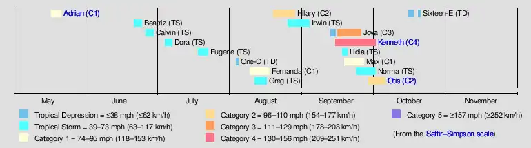 The first storm of the season, Hurricane Adrian, formed off the southwest coast of El Salvador and made the closest approach of any hurricane to the country on record. Most of June was quiet until the end of the month, when two tropical storms developed. July remained inactive as well, as only two tropical storms formed. In August, the activity picked up somewhat; the Central Pacific had its first and only depression of the year and four tropical storms, two of which became hurricanes, forming in the Eastern Pacific. September was the most active month of the year; six tropical storms formed, four of which became hurricanes, and two of the hurricanes strengthened further to become the only major hurricanes of the year. The strongest storm of the season was Hurricane Kenneth, whose remnants briefly threatened Hawaii near the end of the month. Activity sharply dropped off in October as only one tropical depression formed. No storms formed in November in both basins, and the season ended on November 30.