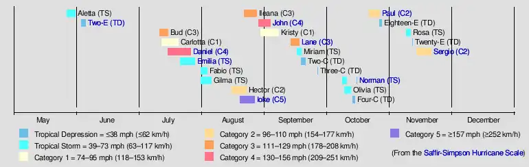 The first storm of the season, Tropical Storm Aletta, formed off the southwest coast of Mexico. After no storms formed in June, the season became active again in July when five named storms developed, including Hurricane Daniel, which was the second strongest storm of the season. Six storms formed during August, including Hurricane Ioke and Hurricane John. September was a relatively inactive month, producing only two storms, of which one was Hurricane Lane. Three storms developed in October and two formed in November; this marked the first time on record when more than one tropical storm developed in the basin during the month of November.