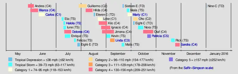The 2015 Pacific hurricane season was the second-most active Pacific hurricane season on record,[1] and featured the strongest tropical cyclone ever observed in the Western Hemisphere: Hurricane Patricia. The season officially started on May 15 in the Eastern Pacific—east of 140°W—and on June 1 in the Central Pacific—between the International Date Line and 140°W—and ended on November 30. These dates typically cover the period of each year when most tropical cyclones form in the Northeastern Pacific tropical cyclone basin.[2] The season's first storm, Hurricane Andres, developed on May 28; the season's final storm, Tropical Depression Nine-C, dissipated on December 31, well after the official end of the season.