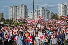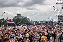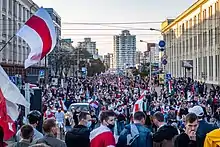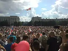 Opposition groups called for a "National March for Freedom" in Minsk and similar marches to occur in cities and towns across the country. Supporters were asked to converge on government buildings and call for the immediate release of all political prisoners, for those responsible for the deaths and torture of protesters to be brought to justice and for the resignation of Alexander Lukashenko.[52] Organizers estimated that 100,000–220,000 people attended the Minsk demonstration.[54] Many were carrying red and white flags.[55] The Belarusian press reported that persons in civilian clothes made arbitrary detentions of opposition supporters after the Minsk rally.[56] Later that evening, it was reported that former Prime Minister of Belarus, Syarhey Rumas, who was dismissed by Lukashenko in June 2020, had posted a message of support for the anti-Lukashenko protesters on his Instagram account.[57] Earlier, Rumas's wife had published a photograph of herself and Rumas on the roof of a building overlooking the protests and a message of support.[58]
