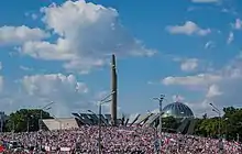 On 23 August, a rally of approximately 250,000 people dubbed "the march for a new Belarus" began at 14:00 in Minsk and headed towards Independence Square.[135][136] Similar rallies were also organized in other cities and towns across the country. Human chains in solidarity with the Belarusian democracy movement were organized in other countries, including one that stretched from Vilnius to the border with Belarus.[137][138] Military vehicles were seen on the streets of Minsk and roadblocks and checkpoints were established on the main roads leading into the city.[139] The army also assumed responsibility for the protection of statues and monuments from local police forces.[140] The area around the Belarusian Great Patriotic War Museum, where protesters had gathered the previous week, was blocked off with barbed wire.[141] It was reported that people were detained by armed officers in military uniform near the museum.[142] The rally later passed the museum where Maria Kalesnikava urged participants to not antagonize security personnel.[143]