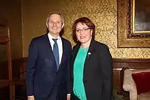 After a brief tenure as a Chairperson of the Board of Open Society Georgia Foundation (Soros Foundation) from 2004 to 2005, Khidasheli joined the Republican Party of Georgia, led by her husband, David Usupashvili. She served as that party's secretary for international affairs from 2005 to 2009. She was elected to the Council of Tbilisi in 2010 and entered the Parliament of Georgia after the Georgian Dream coalition, of which the Republican Party was member, defeated Saakashvili-led United National Movement in the 2012 election. She chaired the parliamentary committee on European integration.[5] In May 2015, Khidasheli succeeded Mindia Janelidze as Georgia's Defense Minister.[6] During her tenure, Khidasheli sought close cooperation with NATO and the United States. She also announced an intention to the end of compulsory conscription as part of military reforms.[7] After the Republican Party decided to leave the Georgian Dream coalition ahead of the scheduled October 2016 parliamentary election, Khidasheli filed resignation and was succeeded by the former security official Levan Izoria. Khidasheli herself criticized the government's choice of her successor.[2]
