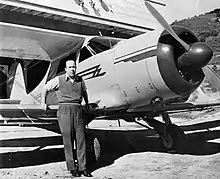 ![]() Tirey Ford pictured with a Beechcraft Staggerwing airplane, circa 1945. | |