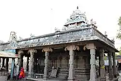 Paasupatheeswarar temple is located in Annamalai Nagar, a place 2 km (1.2 mi) from Chidambaram and inside the premises of Annamalai University. The temple has a three tiered rajagopuram on the eastern side with concentric rectangular walls surrounding the temple. The sanctum is approached through a pillared hall called mukha mandapa and an artha mandapa. The shrine of the goddess is located in the mukhamandapa facing south. The presiding deity in the form of lingam (an iconic form of Shiva) is located in the sanctum. There is a circumabulatory passage around the shrines. The pillars in the hall leading to the sanctum has sculpted images depicting various Hindu legends. The pillared halls in the hall has legends of Arjuna doing penance.[1] The image of Parvati with her hair unlocked is a notable feature.[3] The metal image of Arjuna getting Pasupathasra from Shiva is housed in the temple.[4]