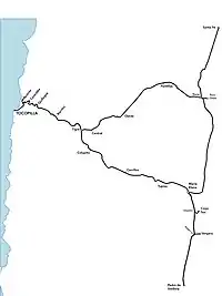 The construction of the mechanized plant "Coya Norte" (known as "María Elena" since 1927) necessitated a new branch, which starting just below the Central station. The branch had several intermediate stations of Tigre, Central (new) Colupito, Cerrillos, Tupiza and María Elena. In 1930 the line was extended to the south when the construction of the “Pedro de Valdivia” plant began. The 116 km María Elena - Pedro de Valdivia branch reaches became the main line; in the 1930s the railroad carried over one million tons. At the Miraje station a connection was made to the Longitudinal Railway.[6]