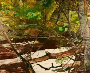 In the late 1990s, Goldenberg turned to landscapes derived from the woodlands, rolling hills and farms of Dutchess County, New York, which culminated in a 1999 show that critic Hilton Kramer wrote, put him on the map as "one of the leading landscape painters of his generation."[8][30][31] Kramer particularly admired as "virtuosic" the pictorial dialogue between the depicted, richly variegated terrain and its distorted reflection in water landscapes such as Pond and Brook (both 2000).[7][8] Others noted, in works such as the large-scale Grandview (2004), the patchwork compositional play, evocative multi-chromatic palettes, dramatic brushwork, and sense of light.[32][11][3] Mario Naves described that painting's "deceptively straightforward depiction of farmland [as] in reality, a fairly intricate not to say abstract orchestration of space, rhythm and incident."[33] In 2002, Goldenberg traveled to Porto Santo Stefano on the Tyrrhenian Sea, to paint a new environment.[12] Critics considered the dark nocturnes, tightly cropped, tangled foliage and wild-running gardens of these works (which some compared to Rousseau and Bonnard) a departure, but nonetheless, highlighted works such as Cactus (2004) for their unexpected perspectives and diverse textural depictions.[11][33][34]