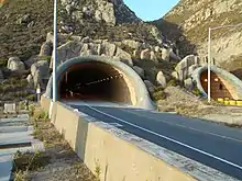 Ground was broken for the new tunnel on May 6, 2005. Boring of twin 30-foot (9 m) diameter tunnels started September 17, 2007, and was completed in 2011.[1] Breakthrough on the northern bore occurred on September 30, 2010.[2] With the completion of the tunnels in 2013, the old Devil's Slide highway was converted into a trail for hikers and bicyclists.[3] The tunnels opened to traffic on March 26, 2013.[4]
