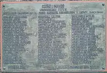 Before the Polish Independence Day (November 11), in 1939, the German police carried out mass arrests of about 300 Poles, including priests, teachers, doctors, judges, workers and activists.[21] Most were released after November 11, but some, including the pre-war mayor, were imprisoned in Piotrków Trybunalski.[21] Further mass arrests of Poles were carried out in January, June and August 1940.[22] On 12–13 June, the Germans arrested 280 people, while on 12–13 August they arrested many women.[23] The victims were then interrogated by the Gestapo, and most were afterwards deported to the Sachsenhausen, Ravensbrück and Buchenwald concentration camps, while some were murdered on the spot.[24] A ghetto for the imprisonment of 16,500 Polish Jews was created in December 1940 and closed off from the outside in December 1941. Hunger was rampant, followed by the typhus epidemic. In December 1942, 15,000 Jews were deported aboard Holocaust trains to the Treblinka extermination camp. Some 200 Jews from Tomaszów are known to have survived World War II.[13] The Germans carried out further executions of Poles, among which was priest Wojciech Dionizy Bryndza-Nacki,[25] and also established and operated a Nazi prison,[26] and a Baudienst forced labour camp for young Poles in the town.[27] In 1944, even 12-year-old Polish children were used as slave labourers to build fortifications in the area in preparation for the advancing Eastern Front.[28] In 1944, during and following the Warsaw Uprising, the Germans deported thousands of Varsovians from the Dulag 121 camp in Pruszków, where they were initially imprisoned, to Tomaszów Mazowiecki.[29] Those Poles were mainly old people, ill people and women with children.[29] 30,000 Poles expelled from Warsaw stayed in the town and nearby settlements, as of 1 November 1944.[29]
