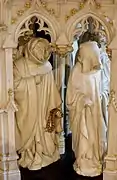 The pleurants (or "mourners", the word translates in English to "weepers") are regarded by art historians as by far the most interesting aspect of the tomb, and among Claus Sluter's finest work.[27] A total of 40 mourners, each measuring between 39 and 42 cm in height,[27] stand in pairs in elaborate Gothic niches below the slab, arranged as if in procession.[28] Their presence serves to illustrate the grieving of the living, rather than emphasise Philip's physical transience. When Philip was being returned to Dijon following his death in Brussels, a group of around 100 paupers were paid to wear mourning cloaks and greet his body outside the city.[3]