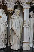 The mourners are grouped in a procession of one or two figures,[3] led by a priest and two choirboys carrying holy water, an acolyte, a deacon and bishop, three cantors and two Carthusian monks. Behind these clerics are members of Philip's family and close members of his court. Although each mourner is given an individualised face, none can be considered as portraits of actual courtiers.[26] According to the art historian Jeffrey Chipps Smith, de Marville and Sluter placed them on an elevated black marble platform so that their mourning features would be more visible.[28]