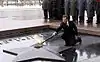 Burning in a shrine under the arch of India Gate since 1971 is the Amar Jawan Jyoti (the flame of the immortal soldier) which marks the Tomb of the Unknown Soldier. The shrine itself is a black marble cenotaph with a rifle placed on its barrel, crested by a soldier's helmet. Each face of the cenotaph has inscribed in gold the words "Amar Jawan" (Immortal Warrior) in Hindi (Devanagri script). The Prime Minister of India pays homage to the country's fallen soldiers along with the Chiefs of Staff of each arm of the Armed Forces on each Republic Day of India. |